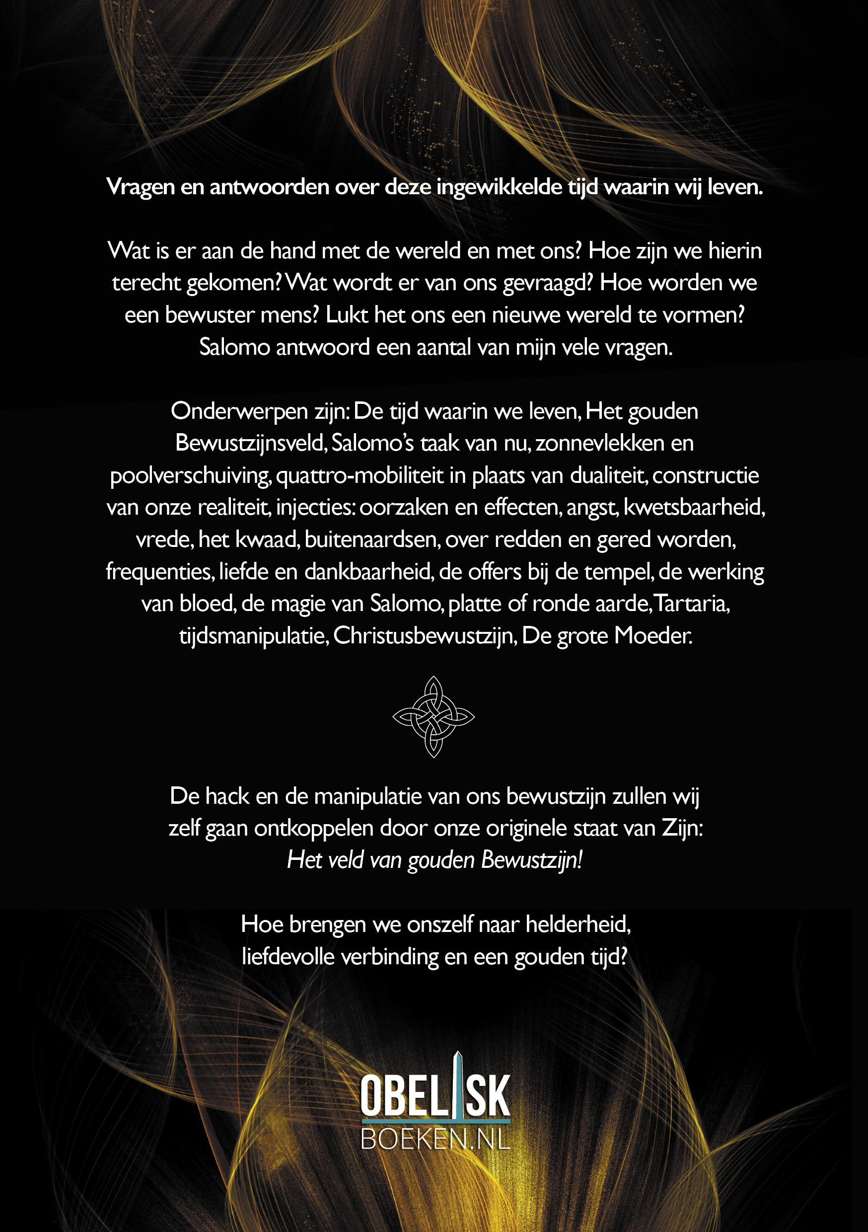 Onderwerpen zijn: de tijd waarin we leven, het gouden bewustzijnsveld, Salomo’s taak van nu, zonnevlekken en poolverschuiving, quattro-mobiliteit in plaats van dualiteit, constructie van onze realiteit, injecties: oorzaken en effecten, angst, kwetsbaarheid, vrede, het kwaad, buitenaardsen, over redden en gered worden, frequenties, liefde en dankbaarheid, de offers bij de tempel, de werking van bloed, de magie van Salomo, platte of ronde aarde, Tartaria, tijdsmanipulatie, Christusbewustzijn, de Grote Moeder.